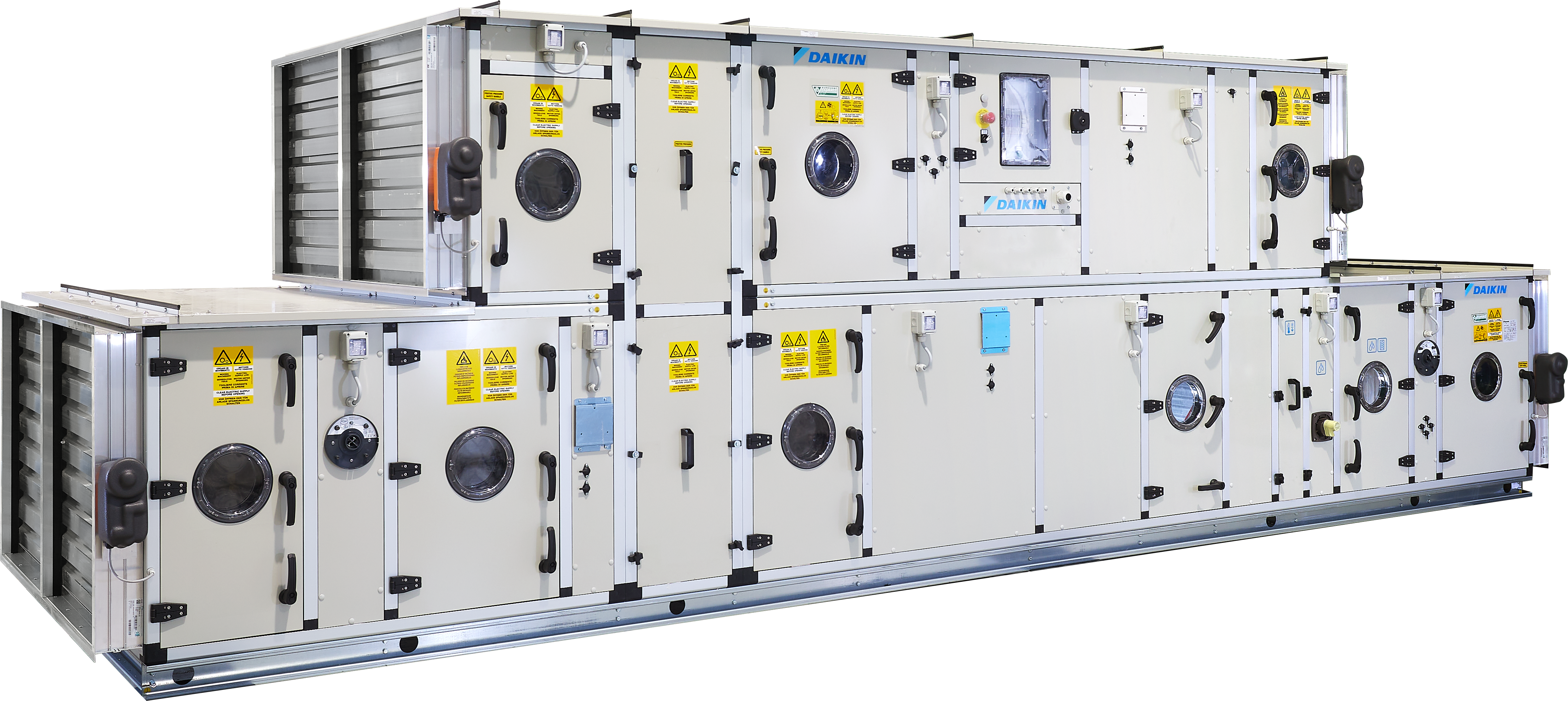 - Der werkseitig eingebaute Schaltschrank, komplett mit direkter digitaler Steuerung (DDC), wird mit eingebauten Temperatur-, Feuchte- und CO2-Sensoren kombiniert, um Mischklappen, Rotationswärmetauscher, Wasserventile, Druckschalter für Filter und Gebläse, Gebläsemotoren und Inverter zu steuern